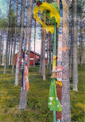 Häävieraat saivat nauttia kesäisen aurinkoisesta säästä. Kutsuvieraita oli perinteisesti niin morsiamen kuin sulhasenkin puolelta. Eikä sellaisia juhlia olekaan, joissa ei jotakin sattuisi. Morsiamen äiti (sulhasen anoppi siis) taisi ottaa boolia pari lasia liikaa, huojuntaa oli havaittavissa. Karhujen häät -yhteisötaideteos on osa Pohjoisen uudet polut -hanketta, jossa kartoitetaan ikäihmisten kulttuurihyvinvointia Sallassa. Hanketta toteuttaa Piste Kollektiivi yhteistyössä Sallan kunnan kanssa ja hanketaiteilijoina toimivat Hanna-Leena Metsävainio ja Anne Niskanen. Ulkoilmataideteos on nähtävissä Saijanlenkin varrella, Saija-Pirtin kohdalla. Paikalle voi viedä tai tuunata omia vieraitaan, milloin vain. Olisi hienoa, jos hääväki kasvaisi koko ajan. Eija Nissinen |