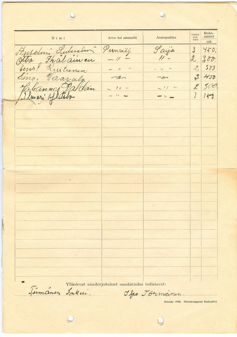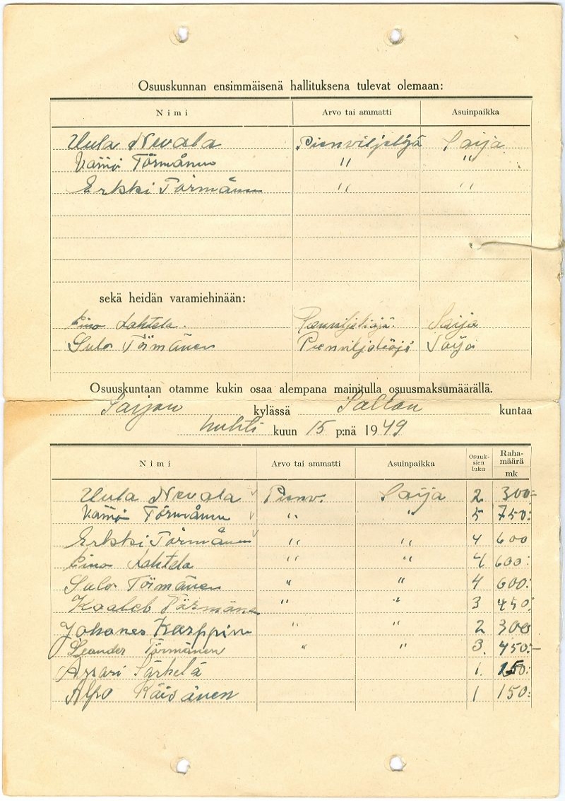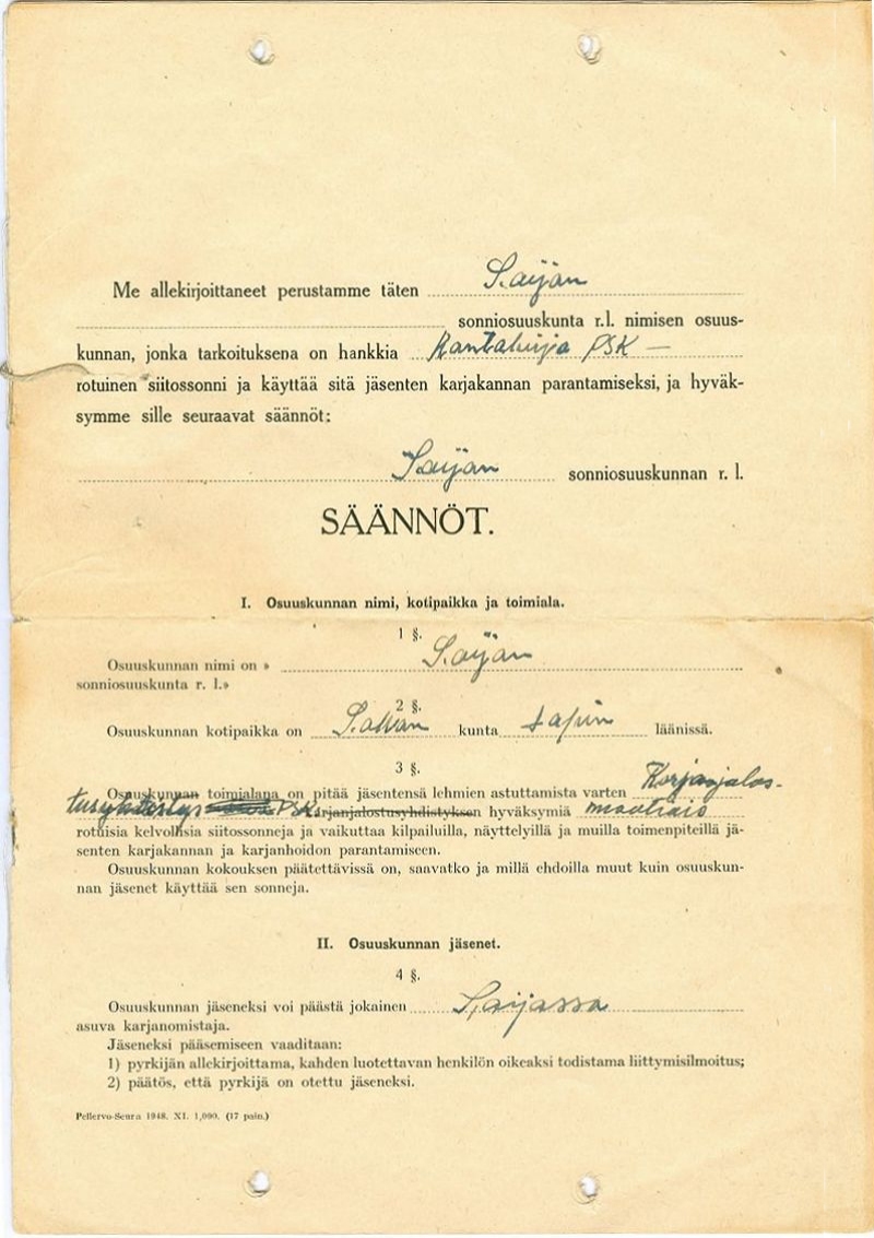 Sonniosuuskunta perustettiin 15.4.1949. Perustamiskirjat saatu lahjoituksena Törmäsen Eerolta, nähtävissä Leanterissa. Lehmiä käytettiin sonnilla mm. Karppisessa ja Törmälässä. Eikä kuulemma ollut kovin mukava homma nuorella ihmisellä lähteä viemään morsianta sulhasen luo kun kaikki tiesivät, että mitä ne siellä sitten tekevät. Törmäsen (Alatalon) Martin talosta löytyi vanhoja asiakirjoja mm. Saijan isojaonaikaisia v. 1935, Saijan Maamiesseuran pöytäkirjoja samoin kuin Saijan Saha-Mylly-Sähkö -osuuskunnan perustamispapereita. Ne ovat nähtävillä Leanterissa. |