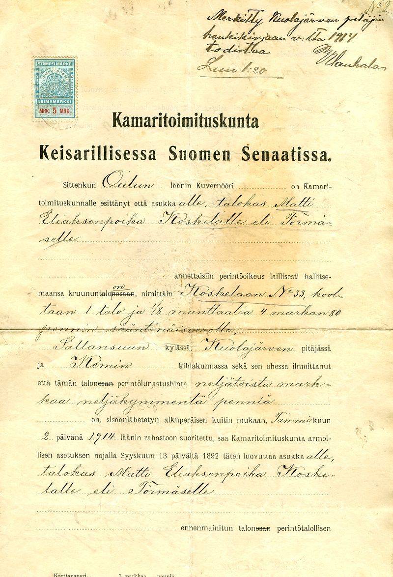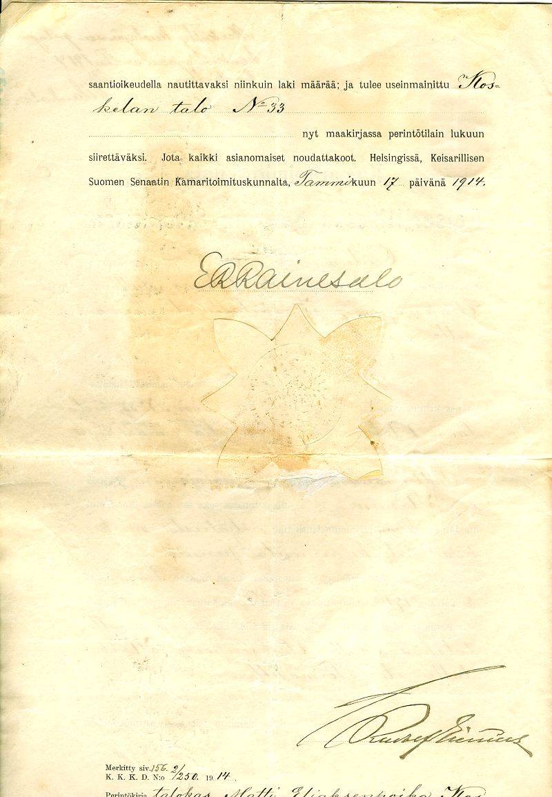 Koskelassa Saariniemen Vesalla oleva vanha asiakirja.