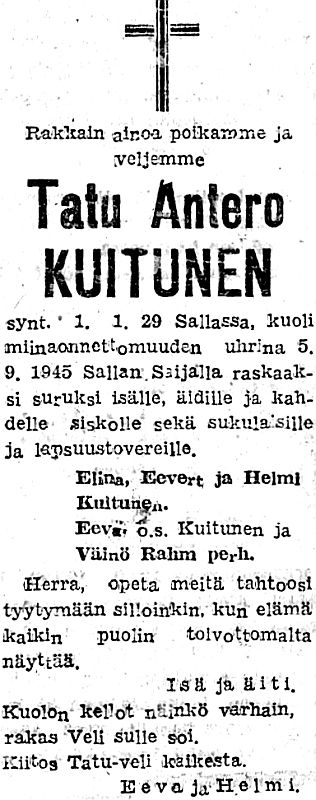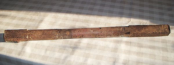 Kuitusen Tatun ajaman hevosen kärryn akseli. Tatuhan ajoi miinaan tuolla Harjuojan tiellä päin. Siinä meni sekä Tatu että hevonen ja kärrykin palasiksi. Tuo on ainoa esine, joka on jäänyt siitä onnettomuudesta jälkipolville.