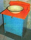 60- ja 70-luvun kalusteita; kommuutti ja pesuvati.