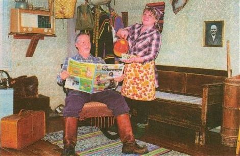 Isäntä Esko lukemassa kotimuseon pirtissä päivän lehteä ja emäntä Eija tarjoilee miehelleen kahvit.