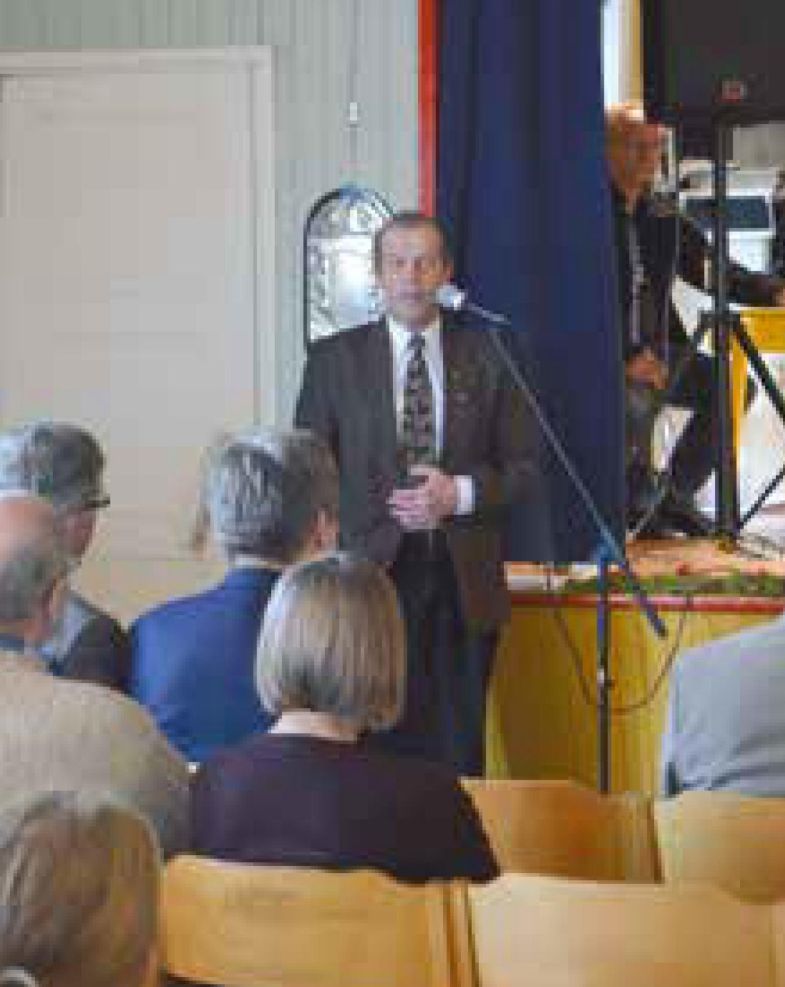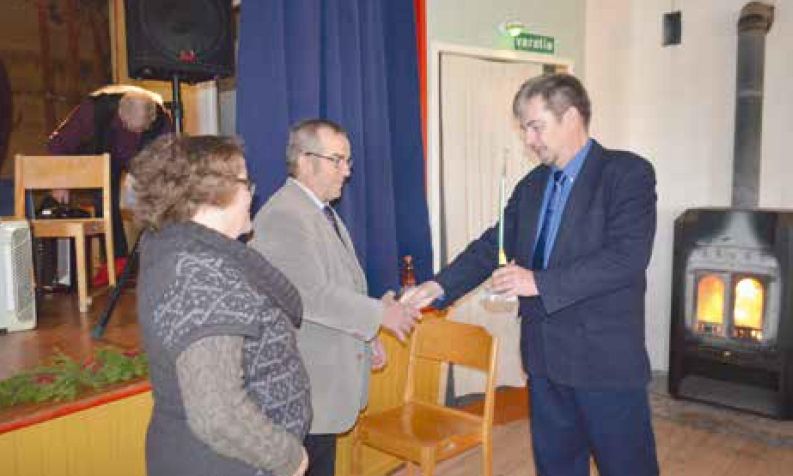 Puheenjohtaja Olli Saariniemi ja varapuheenjohtaja Raili Salla ottivat vastaan onnittelut, vuorossa Riistanhoitoyhdistyksestä toiminnanjohtaja Kari Hänninen.