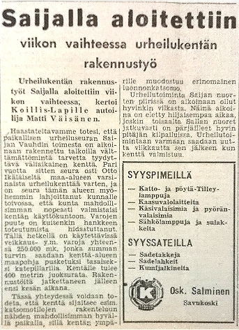 Koillis-Lapin juttu Saijan urheilukentästä kesällä 1961.