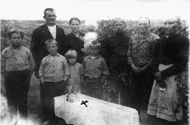 Perheen lapsen hautajaiset 20-luvulla. Vasemmalta Vilho, takana Viitasaarelta Saijalle muuttanut isä Juho, Osmo, Ilma, takana äiti Maria Elisabeth, Kosti, Johannes, tuntematon ja Liisa Saariniemi os. Huumonen, eli Pikku-Liisa, joka oli kirkonkylän pappilan piika, kotoisin Siikajoelta ja tuli vaimoksi Pekkalaan Pitkä-Erkille. |