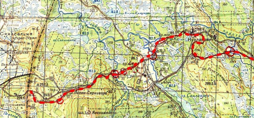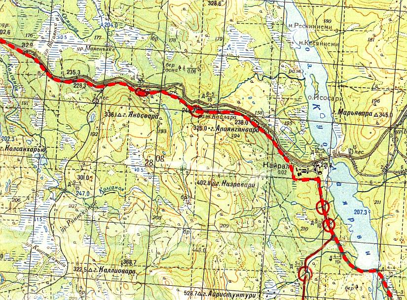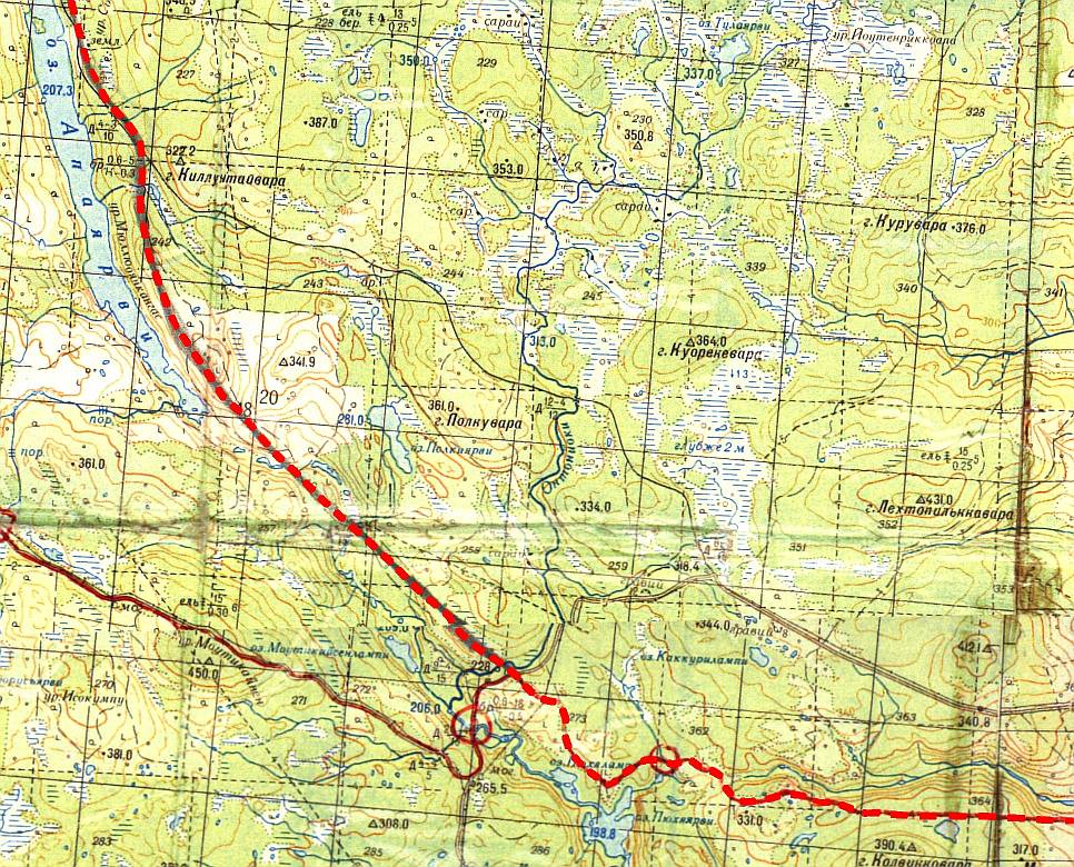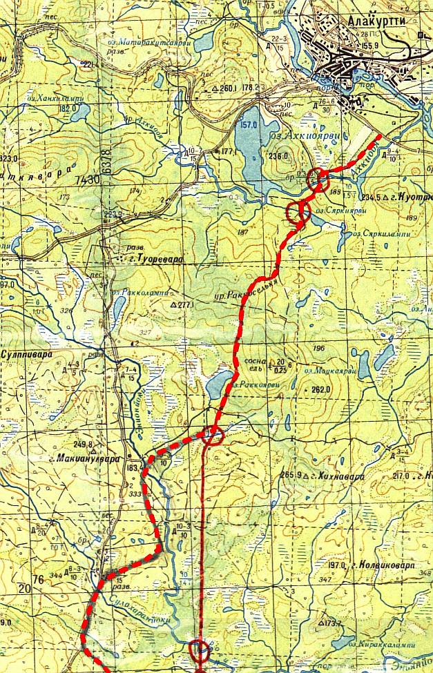 Näihin karttoihin on merkitty Venäjän puoleinen moottorikelkkailureitti Sallan raja-asemalta Alakurttiin.